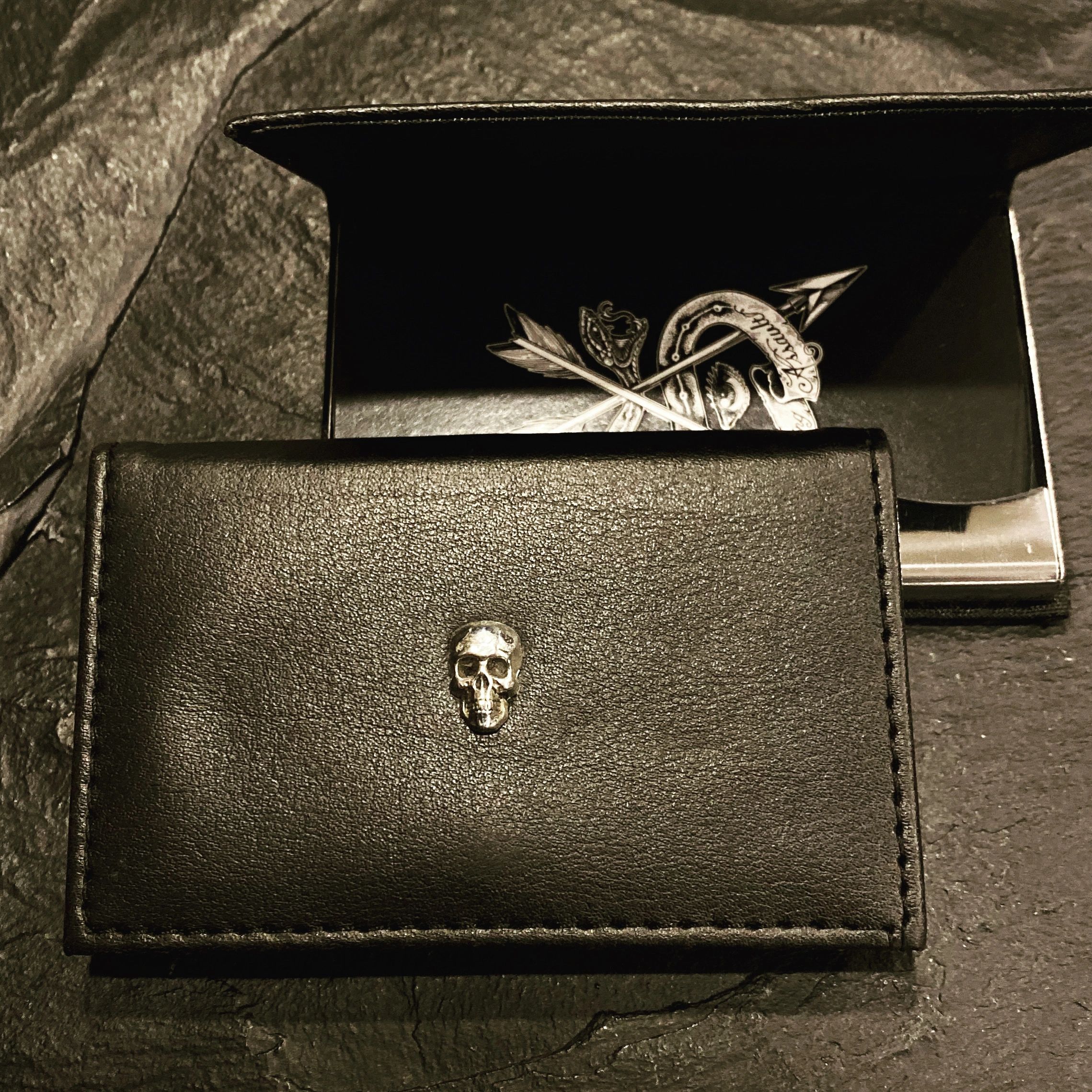 Leather and stainless steal business card holder with sterling silver skull.
