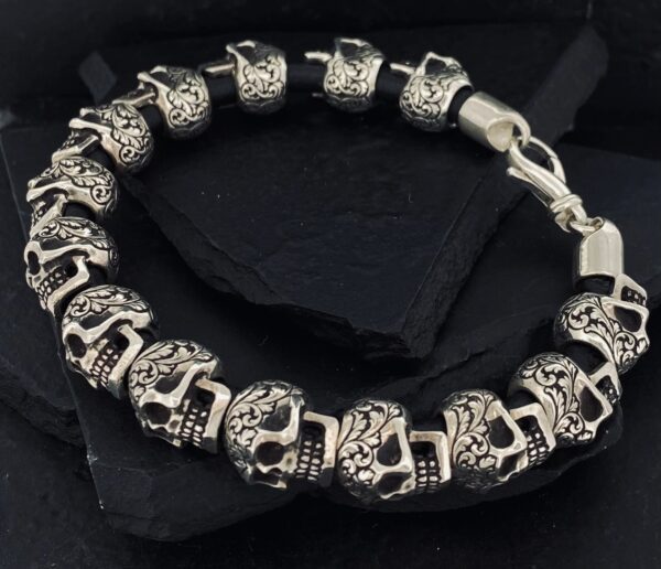 ** Important ** WHEN SELECTING WRIST SIZE, PLEASE SELECT THE SIZE OF YOUR WRIST… NOT THE LENGHT OF THE BRACELET. ADDITIONAL LEGTH WILL WE ADDED TO INSURE COMFORT. ALL ITEMS ARE MADE TO ORDER FOR YOU AND TAKES APPROXIMATELY 3 TO 6 WEEKS FOR COMPLETION EACH SKULL BEAD MEASURES APPROXIMATELY 13 MM FROM CHIN TO TOP OF HEAD. CUSTOM CONFIGURATIONS AVAILABLE. PRICE APON REQUEST THIS BRACELET IS MADE WITH A GENUINE LEATHER AND SHOULD NOT BE SUBMERGED IN WATER OR ANY LIQUID.